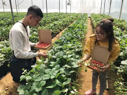 Với diện tích 7.000 mét vuông, vườn dâu tây được canh tác theo công nghệ mới, phương pháp trồng giá thể trên giàn cao khoảng 1m so với mặt đất. Chủ vườn cũng áp dụng hệ thống tưới nước tự động và nói không với các loại hóa chất nên sản phẩm an toàn cho sức khỏe, có thể thưởng thức quả tại chỗ. Ngày thường, vườn dâu tây mở cửa miễn phí, du khách tự do vào hái, ăn thử và mua về sử dụng hoặc làm quà, giá tùy vào loại to hay nhỏ, dao động từ 100.000 đến 250.000 đồng/kg. Hằng ngày, khu vườn dâu của Hợp tác xã đón từ 500-700 lượt khách trong và ngoài nước, vào những ngày cuối tuần hay dịp nghỉ lễ, con số này tăng cao gấp đôi.
