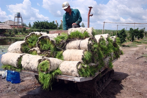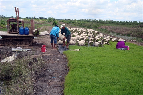 Khắc phục tình trạng trên, các trang trại, công ty sản xuất nông nghiệp và nhiều hộ nông dân ở các tỉnh Đồng Tháp, An Giang, Long An, Kiên Giang, Cà Mau, Bạc Liêu, Sóc Trăng…đã triển khai mô hình gieo mạ thảm, vừa tiết kiệm được nước vừa giảm được tỷ lệ hao hụt giống, đem lại hiệu quả cao. Làm theo cách này, cứ 1 m2 gieo mạ thảm có thể cấy 1.000 m2 ruộng lúa. Cây mạ lại cứng, dễ gieo cấy và năng suất cấy thủ công cũng tăng lên gấp nhiều lần. Ưu điểm nữa của gieo mạ thảm là dễ chuyển đổi từ cấy thủ công truyền thống sang cấy công nhiệp vì mạ thảm và mạ gieo đều phù hợp với máy cấy công nghiệp. Gieo mạ thảm còn giúp chủ động phòng chống được các mầm bệnh từ mạ non vàcó thể gieo mạ trong mọi thời tiết để ứng phó vời biến đổi khí hậu ở ĐBSCL hiện nay.