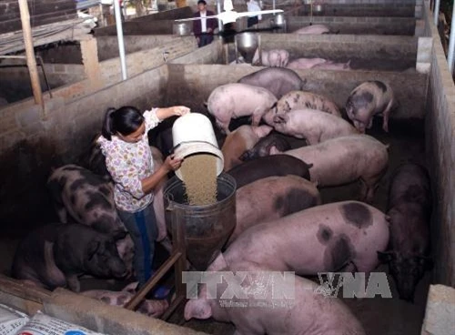 | Cho lợn ăn tại một trang trại chăn nuôi lợn ở Bắc Kạn. Ảnh: Vũ Sinh - TTXVN |