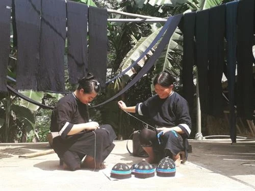 | Phụ nữ dân tộc Nùng An, xã Phúc Sen (Quảng Uyên) khâu mũ vải. Ảnh: Thủy Tiên |