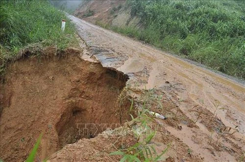 | Một vị trí bị sạt lở ta luy âm hở hàm ếch trên Tỉnh lộ 674. Ảnh: Quang Thái- TTXVN |