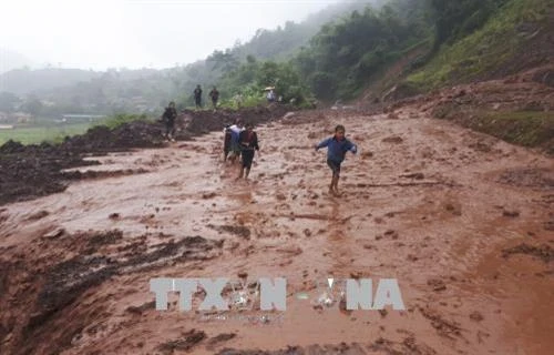 | Điểm sạt lở tại Km63+260 Quốc lộ 4H. Ảnh: Xuân Tư - TTXVN |