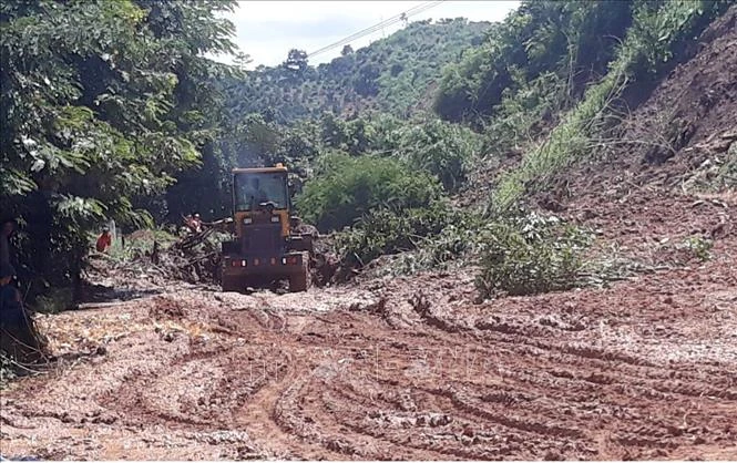 Mưa lũ gây sạt lở nhiều tuyến giao thông huyết mạch tại huyện Krông Nô. Ảnh: TTXVN phát