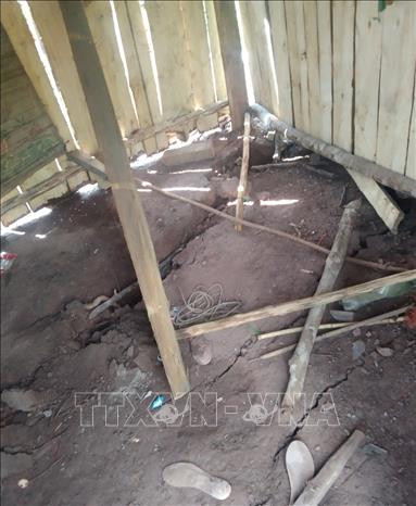 Nền nhà của một hộ dân xã Nậm Khăn (huyện Nậm Pồ) bị sạt, nứt gãy. Ảnh: TTXVN phát