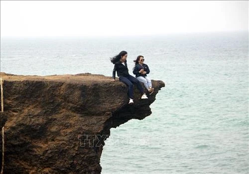 | Hai nữ du khách đang tận hưởng cảm giác mạnh trên Mũi Trèo. Ảnh: Trịnh Bang Nhiệm - TTXVN |