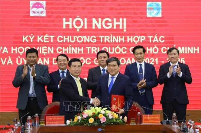 PGS,TS Nguyễn Duy Bắc ( bên phải), Phó Giám đốc Học viện Chính trị Quốc gia Hồ Chí Minh và Thứ trưởng, Phó Chủ nhiệm Ủy ban Dân tộc Lê Sơn Hải ký kết Chương trình hợp tác giai đoạn 2021-2025. Ảnh: Văn Điệp - TTXVN