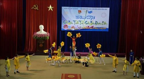 | Tiết mục giao lưu văn nghệ tại Chương trình Đêm hội sắc màu tuổi trẻ - Sắc màu đoàn kết Cụm Đồng bằng sông Hậu. Ảnh: Nhật Bình - TTXVN |