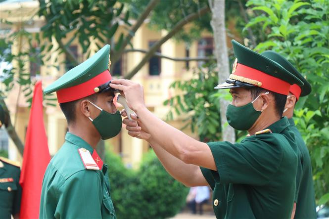 Kiểm tra y tế cử tri chiến sĩ tại Tiểu đoàn 303/e584, Bộ Chỉ huy Quân sự tỉnh Đắk Lắk bỏ phiếu sớm tại khu vực bỏ phiếu số 8, xã Hòa Xuân, thành phố Buôn Ma Thuột. Ảnh: Tuấn Anh – TTXVN