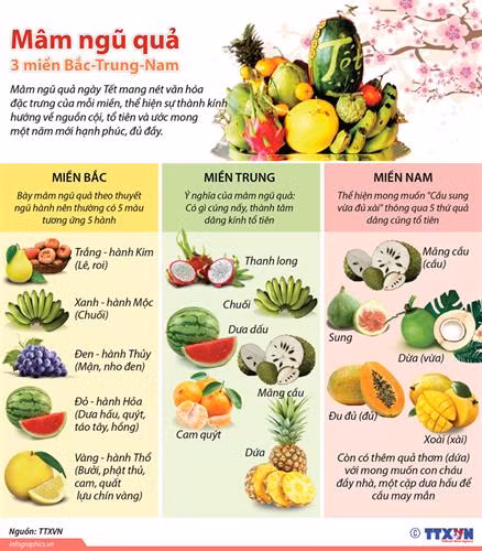 Tùy vào điều kiện hoàn cảnh mỗi gia đình, mỗi vùng miền mà có cách bày biện, sắp xếp mâm ngũ quả khác nhau. Nhưng nhìn chung mâm ngũ quả trên bàn thờ ngày Tết vẫn là nơi hội tụ của hồn quả, hương cây và ý nguyện cầu hòa, an, đủ mà người dân Việt gửi gắm.