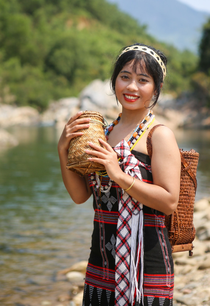 Cô gái Cơ Tu với trang phục truyền thống và các sản phẩm giỏ tre tự sản xuất. Ảnh: Trần Lê Lâm – TTXVN