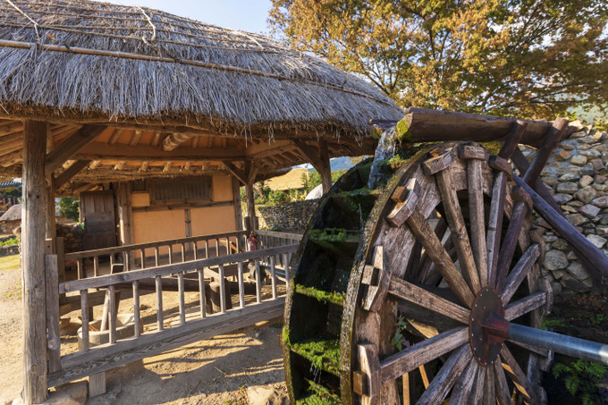 Cối giã gạo dùng sức nước ở Làng dân gian Naganeupseong. Ảnh: Anh Nguyên