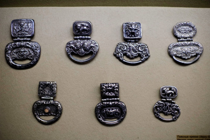 Dây đai lưng và các đồ trang trí bằng vàng của người đứng đầu liên minh bộ lạc Tuva xưa. Ảnh: Trần Hiếu - PV TTXVN tại Nga
