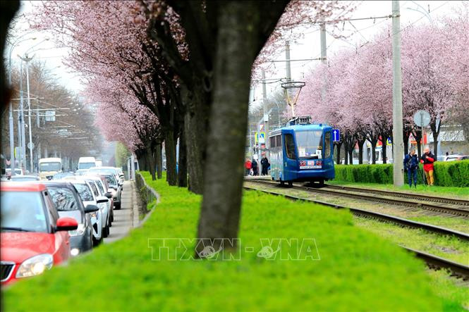 Đường phố Krasnodar rực rỡ sắc hoa anh đào. Ảnh: Trần Hiếu - PV TTXVN tại Nga