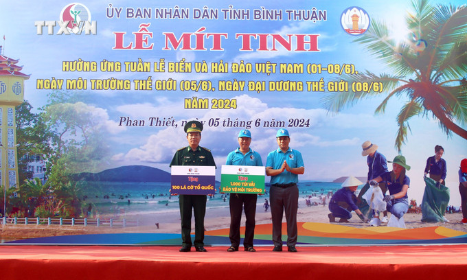Dịp này, Ban Tổ chức trao tặng 100 lá cờ Tổ quốc và 1.000 túi vải bảo vệ môi trường cho Bộ đội Biên phòng tỉnh và thành phố Phan Thiết. Sau Lễ mít tinh, các đại biểu cùng các lực lượng vũ trang, đoàn thanh niên và người dân trên địa bàn tham gia hoạt động dọn vệ sinh, thu gom rác tại khu vực công viên biển Đồi Dương- Thương Chánh và diễu hành kêu gọi người dân bảo vệ môi trường.