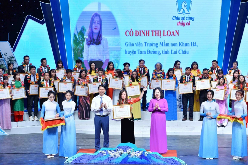 BTC trao Bằng khen của Trung ương Hội Liên hiệp Thanh niên Việt Nam; biểu trưng của Chương trình cho các thầy cô giáo. Ảnh: Minh Đức - TTXVN