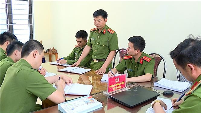 Đại úy Cà Văn Nghĩa, Đội Cảnh sát điều tra tội phạm về hình sự - kinh tế - ma túy, Công an huyện Vân Hồ, tỉnh Sơn La (tay cầm sổ) tại một buổi họp. Ảnh: Nguyễn Cường – TTXVN