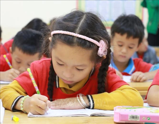 Trường Tiểu học Nghi Quang, huyện Nghi Lộc lựa chọn cách tiếp cận nhẹ nhàng, dễ hiểu nhất với mục đích là học sinh biết đọc viết và bước đầu hiểu sơ giản về tiếng mẹ đẻ và vận dụng nó trong môi trường của trẻ. Ảnh: Bích Huệ - TTXVN