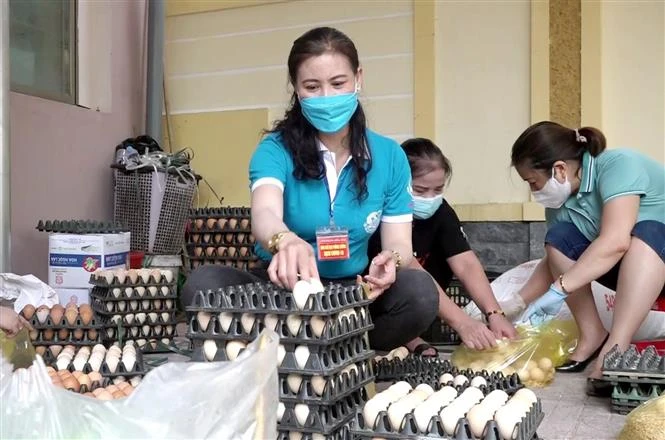 Hội Phụ nữ thành phố Vinh (Nghệ An) tiếp nhận và kết nối hỗ trợ tiêu thụ mỗi ngày gần 8.000 quả trứng cho gia đình chị Nguyễn Thị Huyền ở xã Đông Vĩnh, thành phố Vinh. Ảnh: Tá Chuyên - TTXVN