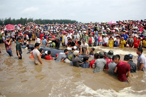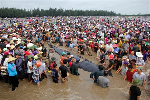 Một số hình ảnh: Các lực lượng chức năng cùng người dân nỗ lực giải cứu cá voi mắc cạn tại bờ biển xã Diễn Thịnh.