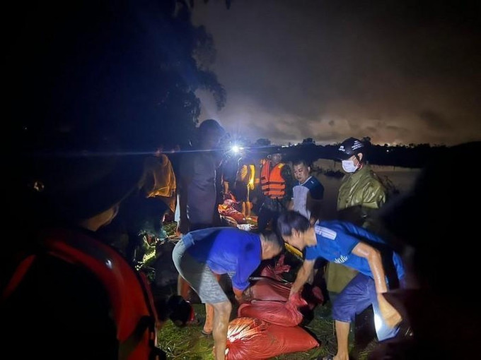 Lực lượng chức năng và người dân dầm mình trong nước lũ để cứu đê trong đêm. Ảnh: TTXVN phát