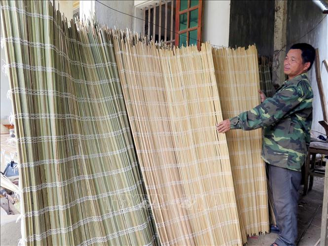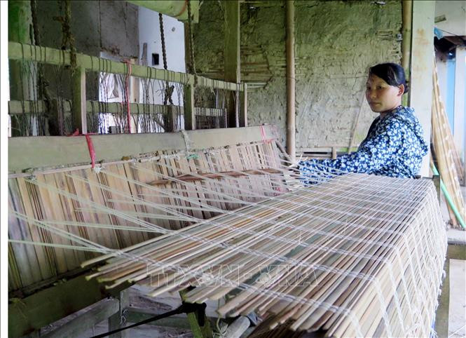 Ông Triệu Văn Quản, thôn Làng Bầng, năm nay đã ngoài 80 tuổi là người đầu tiên đưa nghề dệt mành cọ về địa phương. Ảnh: Quân Trang-TTXVN
