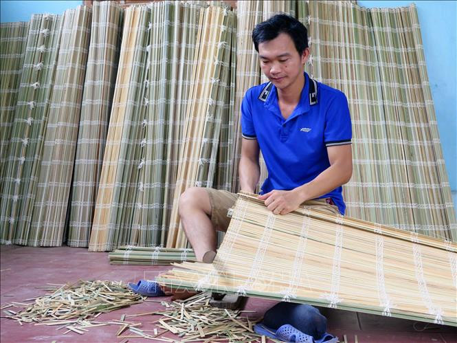 Sau khi dệt xong, mành được cắt phẳng phiu hai đầu để bán ra thị trường. Ảnh: Quân Trang-TTXVN