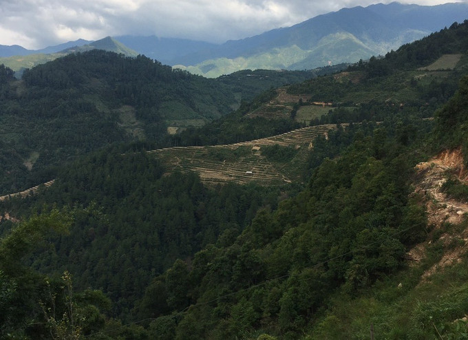 Vị trí các khối đá khắc cổ mới được phát hiện nằm trong rừng phòng hộ ở thôn Háng Chua Say, xã Chế Cu Nha, huyện Mù Cang Chải. Ảnh: TTXVN phát