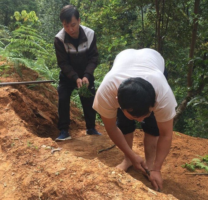 Cán bộ phòng Văn hóa và Thông tin huyện Mù Cang Chải và cán bộ xã Chế Cu Nha kiểm tra thực địa tại khu vực phát hiện những khối đá khắc cổ. Ảnh: TTXVN phát