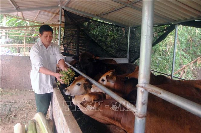 Cựu chiến binh Hoàng Ngọc Tư chăm sóc đàn bò. Ảnh: Quang Quyết-TTXVN