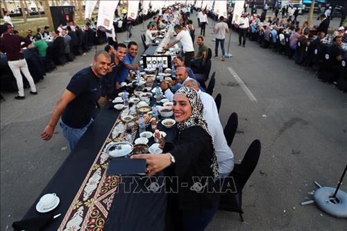 | Người dân Ai Cập bên bàn tiệc Iftar dài nhất thế giới tại Thủ đô hành chính mới của Ai Cập cách Cairo khoảng 50 km về phía đông ngày 1/6. Ảnh: THX/TTXVN |