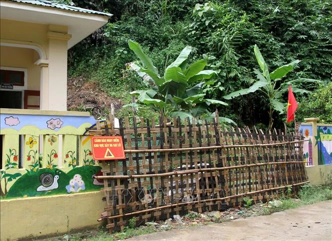 Điểm Trường mầm non Tam Hợp tại bản Xốp Nặm, xã Tam Hợp buộc phải đóng cửa vì nguy cơ sạt lở đất đá, biến báo nguy hiểm cũng được chính quyền địa phương đặt ở khu vực này. Ảnh: Văn Tý-TTXVN