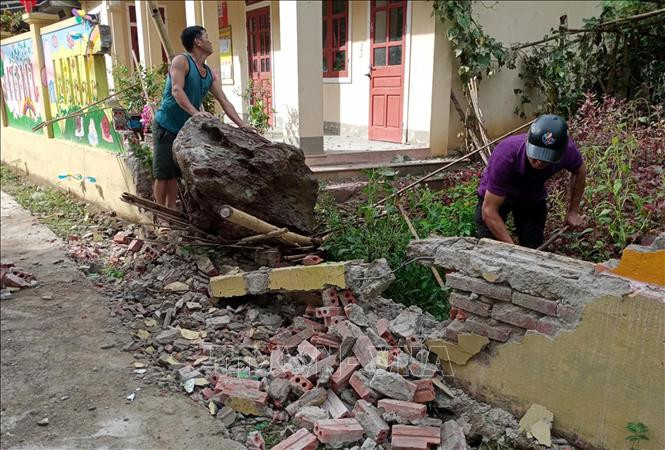 Đầu tháng 9/2021, một viên đá lớn rơi xuống khuôn viên Điểm Trường mầm non Tam Hợp tại bản Xốp Nặm, xã Tam Hợp. May mắn vào thời điểm đó nhà trường chưa bước vào năm học mới nên không có thiệt hại về người. Ảnh: TTXVN