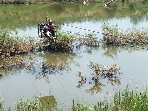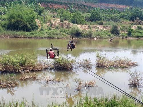 | Người dân tại huyện Ngọc Hồi vượt sông bằng đu dây. Ảnh: Quang Thái - TTXVN |