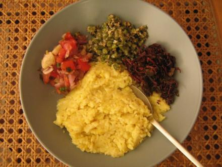 Món khichdi bao gồm cơm trắng và đậu lăng được nấu với chung với nhau và phủ một chút ghee (bơ làm từ sữa bò) hoặc sữa đông lên trên. Món ăn này đơn giản nhưng vẫn đủ dinh dưỡng và no bụng.