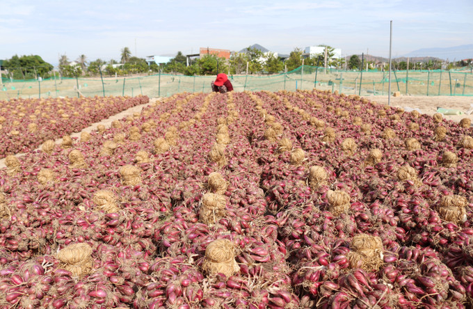 Người dân xã Nhơn Hải, huyện Ninh Hải, phơi hành tím để chuẩn bị đưa đi tiêu thụ. Ảnh: Nguyễn Thành – TTXVN