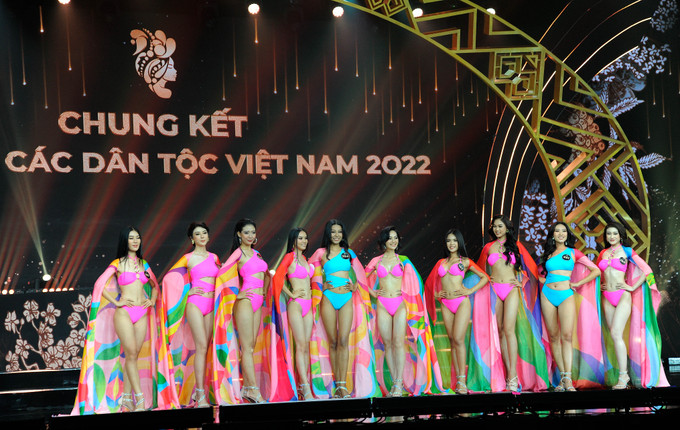 Các thí sinh thể hiện phần thi trang phục áo tắm tại Chung kết Hoa hậu các dân tộc Việt Nam 2022. Ảnh: An Hiếu