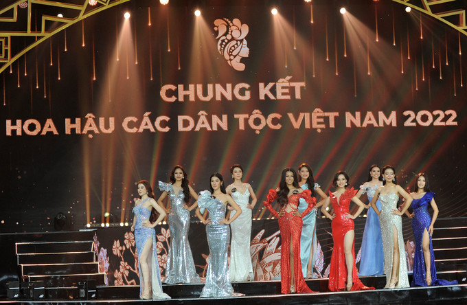 Các thí sinh thể hiện phần thi áo dạ hội tại Chung kết Hoa hậu các dân tộc Việt Nam 2022. Ảnh: An Hiếu