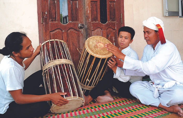Tâm huyết với việc gìn giữ và lan tỏa những điệu trống ghinăng, paranưng, năm 2019, nghệ nhân Phú Văn Lương đã được Nhà nước phong tặng danh hiệu nghệ nhân ưu tú. Ảnh: An Hiếu