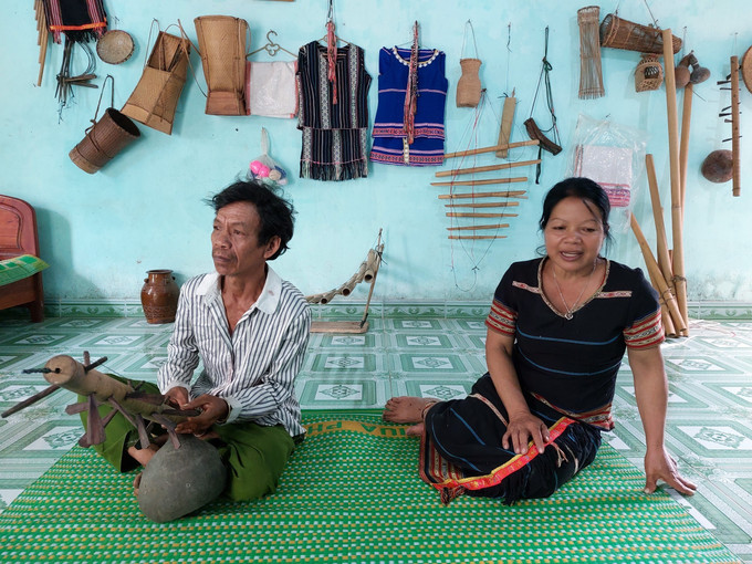 Nghệ nhân Y Trieng ở thị trấn Đăk Rve, huyện Kon Rẫy (Kon Tum) và chồng biểu diễn bài hát dân ca của người Jơ Lâng. Ảnh: Khoa Chương – TTXVN