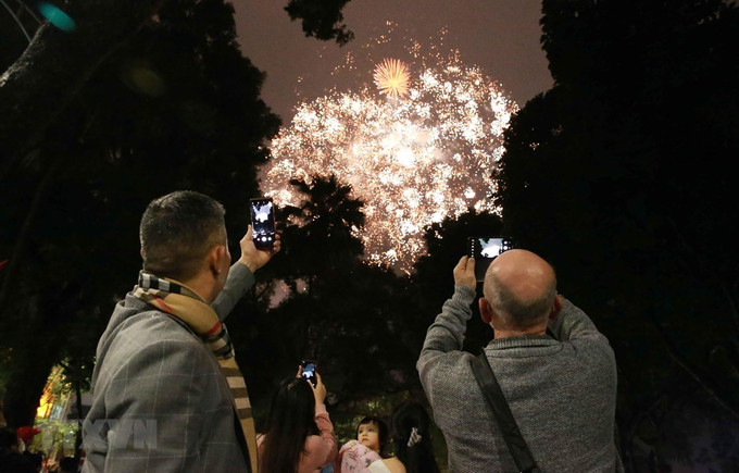 Khách du lịch xem bắn pháo hoa tại hồ Hoàn Kiếm. Ảnh: Doãn Tấn/TTXVN