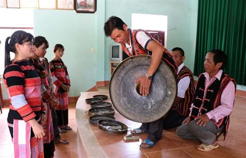 | Không chỉ học múa, chị em phụ nữ ở xã Đăk Mang cũng được học cách cầm và chơi cồng chiêng như những người đàn ông. Ảnh: Quốc Dũng - TTXVN |