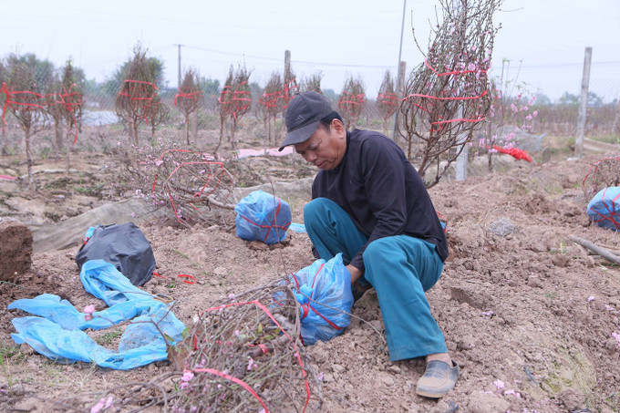 Phục vụ thị trường Tết năm nay, ngoài diện tích đào cây, đào cành truyền thống, ông Triệu Quốc Phụng, xóm Tiền Phong 2 còn đầu tư trồng đào ghép để tăng thêm thu nhập. Hiện nay vườn đào hơn 400 gốc của nhà ông đã bán được trên 90% số cây. Gia đình đang chuẩn bị dọn dẹp vườn, tiếp tục nhân giống lứa đào tiếp theo để phục vụ thị trường Tết.