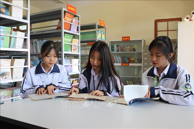 Nguyễn Tú Linh (bên phải) và bạn cùng lớp tìm hiểu kiến thức tại thư viện nhà trường. Ảnh: Quang Quyết-TTXVN