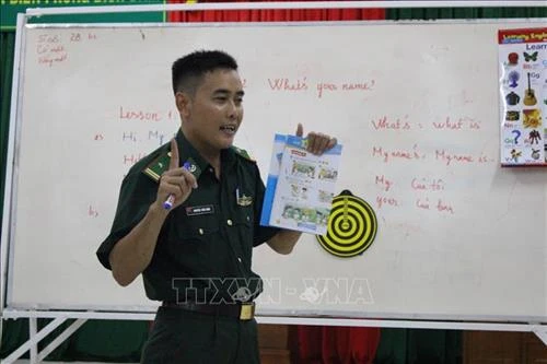 | Thiếu tá Nguyễn Tuấn Hình trong giờ lên lớp dạy tiếng Anh cho các học sinh trên đảo Bích Đầm. Ảnh: Phan Sáu - TTXVN |