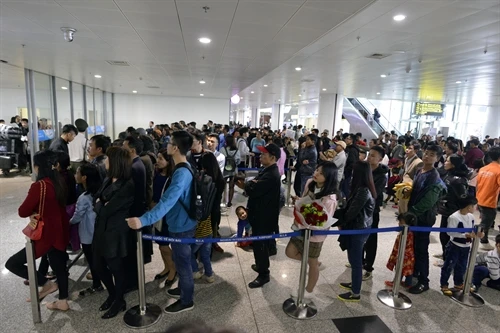 | Khu vực đón khách tại sảnh nhà ga T2 sân bay quốc tế Nội Bài luôn tấp nập. Ảnh: Lê Hiếu - TTXVN phát |