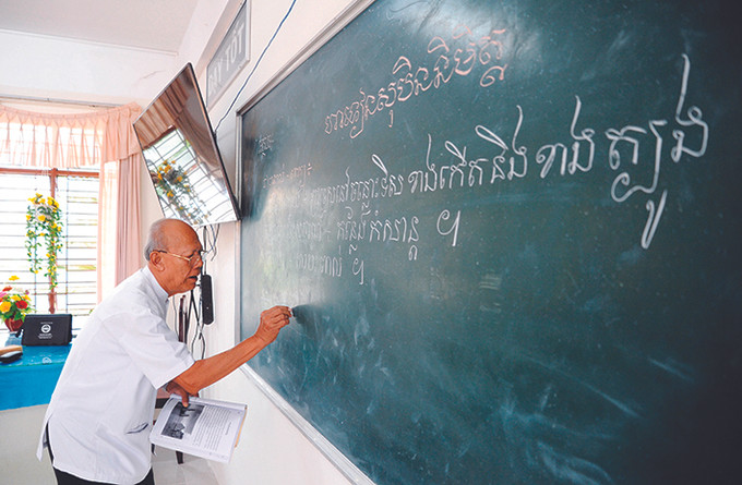Dù đã ngoài 80 tuổi, thầy Lâm Es vẫn miệt mài với công tác khuyến học, thường xuyên đứng lớp dạy chữ Khmer tại nhiều điểm trường trên địa bàn tỉnh Sóc Trăng và các tỉnh, thành ở Nam Bộ. Ảnh: An Hiếu