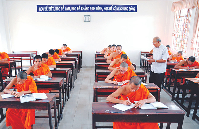Thầy Lâm Es với các tăng sinh Trường bổ túc văn hóa Pali Trung cấp Nam Bộ (Sóc Trăng). Ảnh: An Hiếu