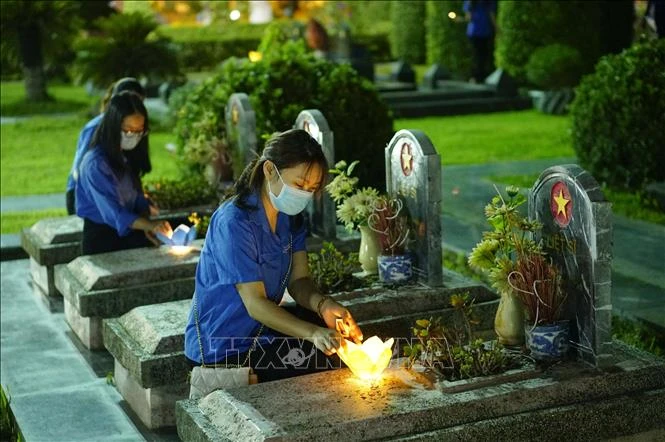 Đoàn viên thanh niên thắp nến trên các phần mộ liệt sỹ. Ảnh: Xuân Tư - TTXVN