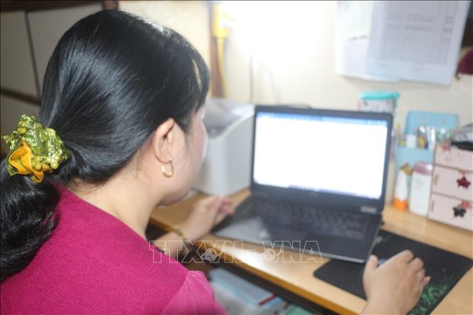 Cô Hạnh chuẩn bị giáo án. Ảnh: Bích Huệ - TTXVN