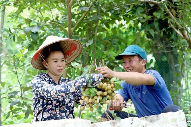 Vợ chồng anh Vì Văn Tuấn ở bản Nà Pàn, xã Nà Nghịu, huyện Sông Mã, tỉnh Sơn La thu hái những chùm nhãn chín mọng để bán cho thương lái. Ảnh: Quang Quyết-TTXVN